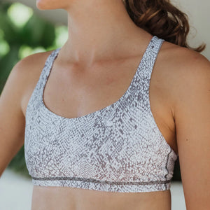 Step into Summer in the Steel Grey Snake IMPI Strappy Bra top. You can match it with plain Steel Grey or double up in the matching Steel Grey Snake IMPI Highwaist short.